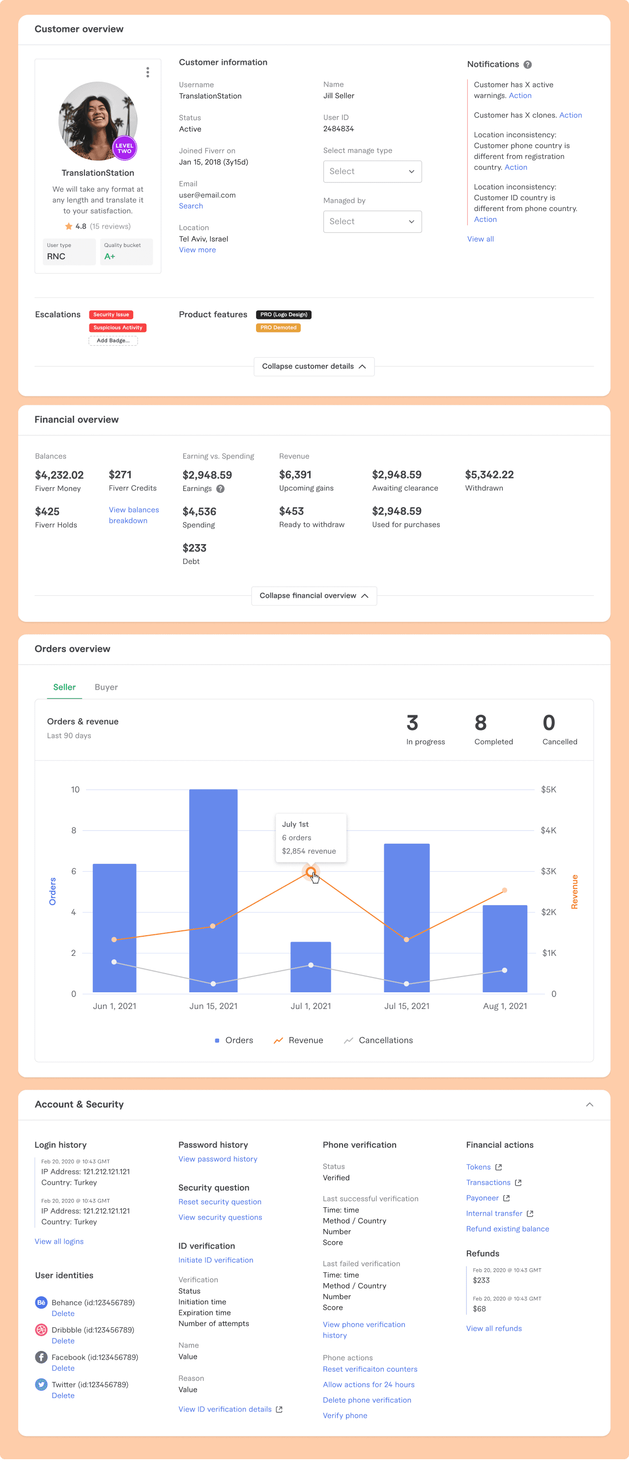 The Customer View is the most-used page in Fiverr’s back-office. It has been in use since the wee beginnings of the company, and over time became a mash-up of design languages and conventions. It was designed on-the-fly by whichever team needed a given feature, from customer support to the security team. After promptly holding a bat-mitzvah for this legacy page that has served us so well, it was decided that an update was due. It’s makeover time!