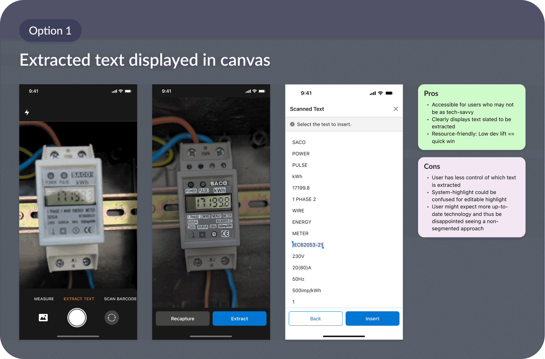 Testing different UX approaches led us to choose option #1 (text extracted to canvas) for the interim, until more resources could be dedicated to this feature